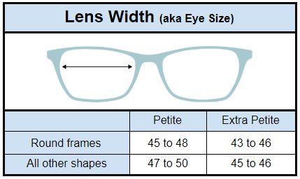 Lens width 45 to 50 is petite in most frame shapes.