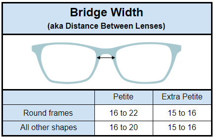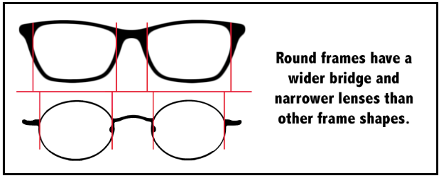 Like lens width, bridge width is different for round frame shapes versus other shapes. Since the round lenses are narrower, the space between them is wider. Most likely, your bridge measurement for round frames will be 2 or 3 mm larger than it is on other frame shapes.